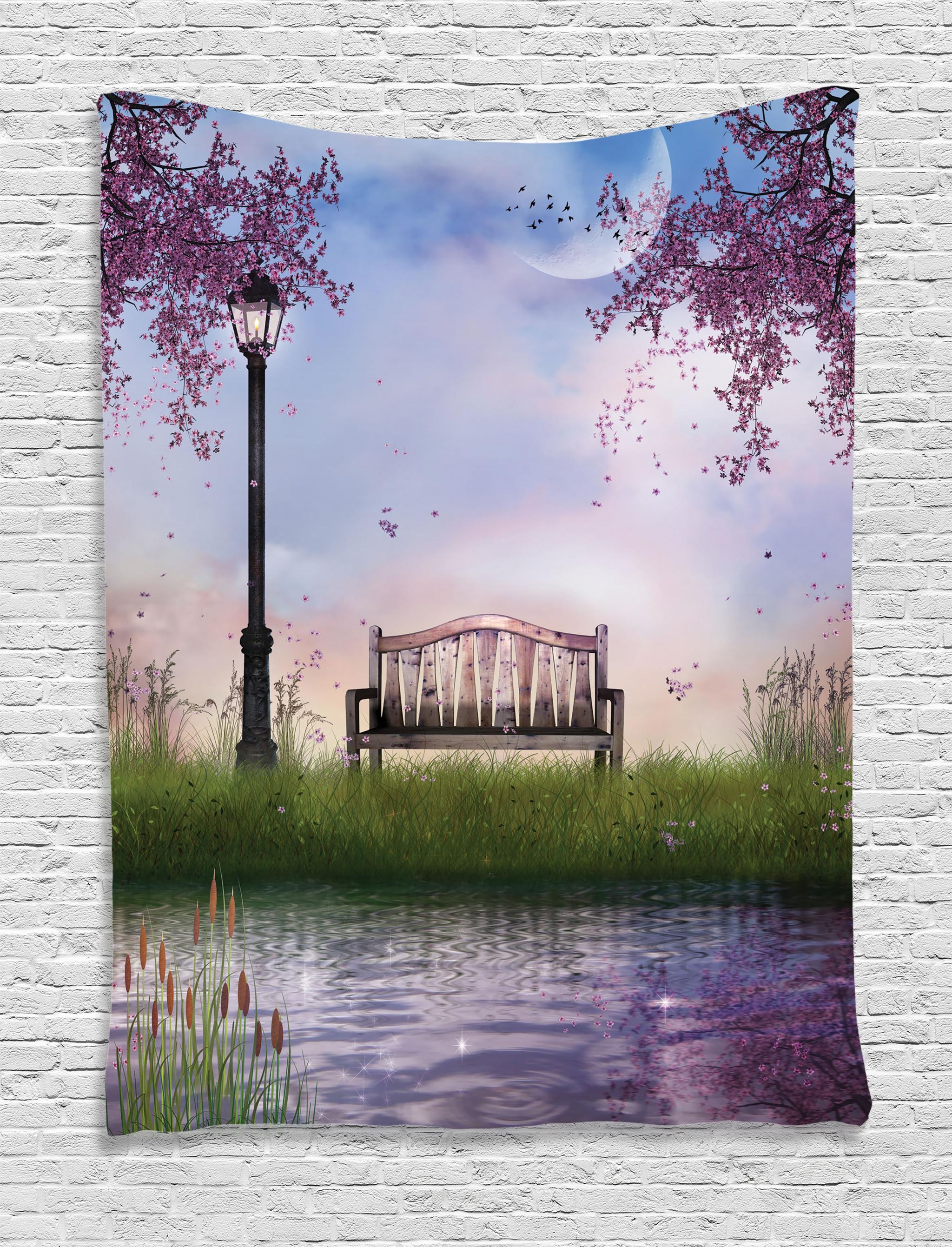 Nature Tapestry Bench On Flowing River With Crescent Moon Lavender Trees And Grass Illustration Wall Hanging For Bedroom Living Room Dorm Decor